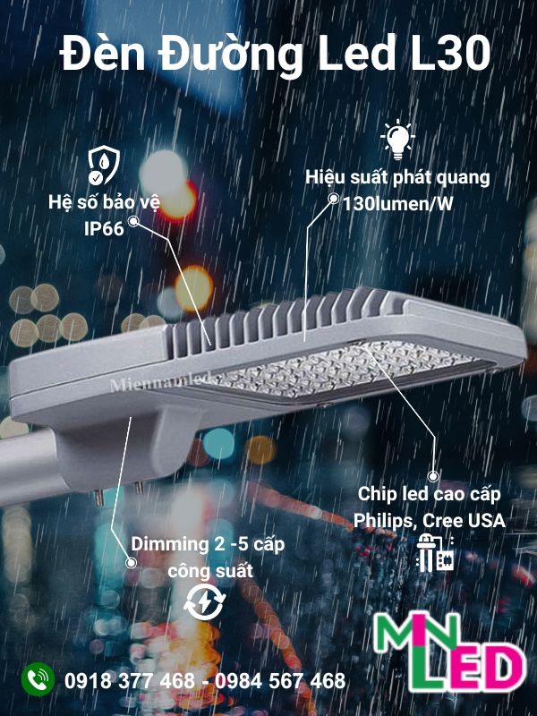 - Đèn đường LED: sử dụng chip LED hiện đại, tiết kiệm điện, độ sáng cao và tuổi thọ lâu dài.