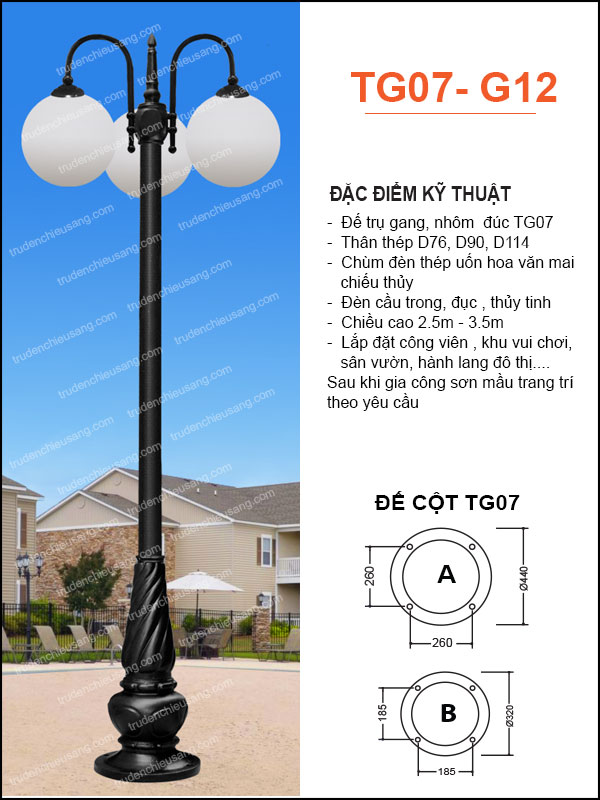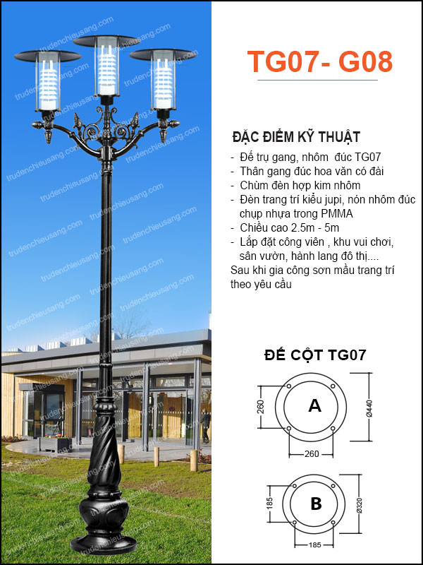 • Thân trụ cao, chắc chắn: Được làm từ gang đúc hoặc thép phủ lớp mạ kẽm nhúng nóng, trụ đèn có độ bền cao, chống oxy hóa hiệu quả, đảm bảo tuổi thọ sử dụng lâu dài.