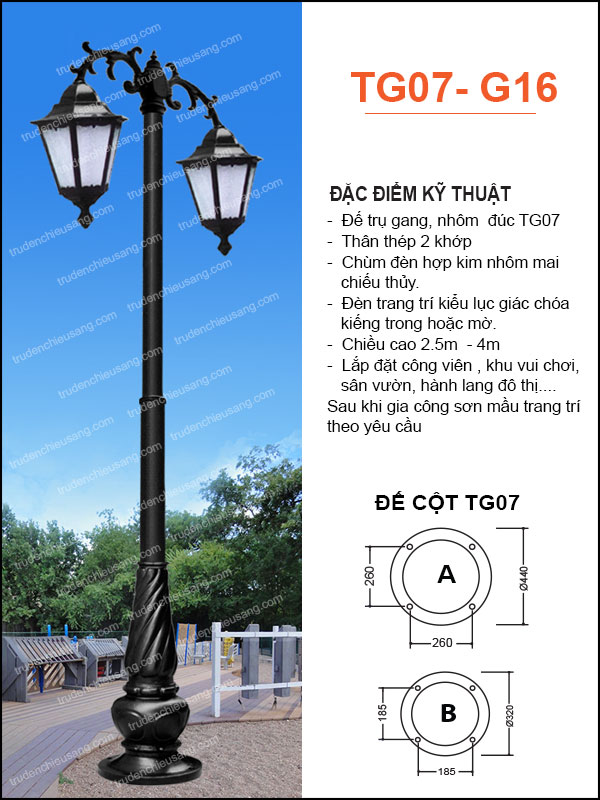 - Thân trụ cao, chắc chắn: Được làm từ gang đúc hoặc thép phủ lớp mạ kẽm nhúng nóng, trụ đèn có độ bền cao, chống oxy hóa hiệu quả, đảm bảo tuổi thọ sử dụng lâu dài.