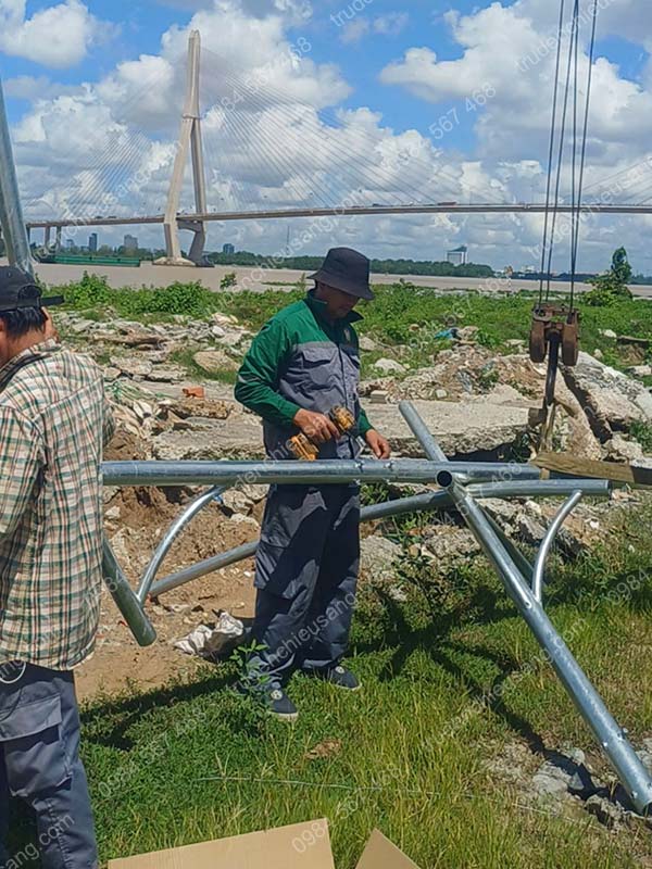Thi công lắp trụ trụ đèn nâng hạ tại cảng quốc tế Long An