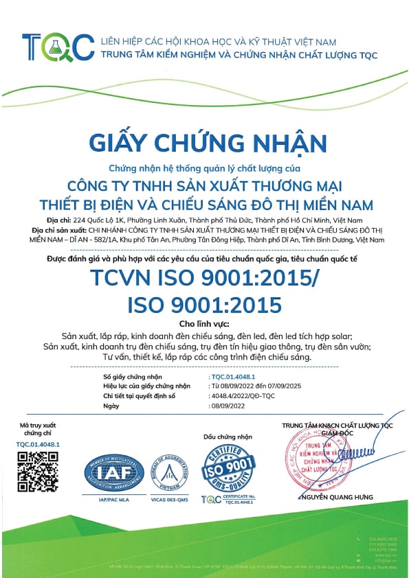 • Chứng nhận TCVN ISO 9001:2015: Chứng nhận TCVN ISO 9001:2015 là phiên bản tiếng Việt của tiêu chuẩn quốc tế ISO 9001:2015 về hệ thống quản lý chất lượng hiệu quả (QMS); đảm bảo cung cấp sản phẩm và dịch vụ đáp ứng yêu cầu của khách hàng và các quy định pháp luật liên quan.