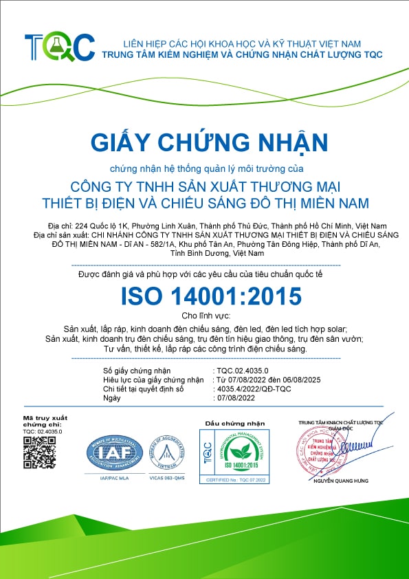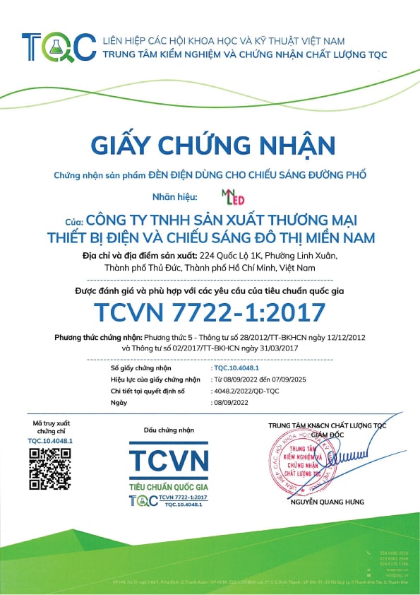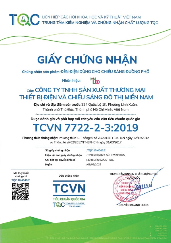 • Chứng nhận TCVN 7722-2-3:2019: chứng nhận đáp ứng các yêu cầu kỹ thuật cụ thể, đảm bảo chất lượng và an toàn cho hệ thống chiếu sáng đường giao thông tại Việt Nam