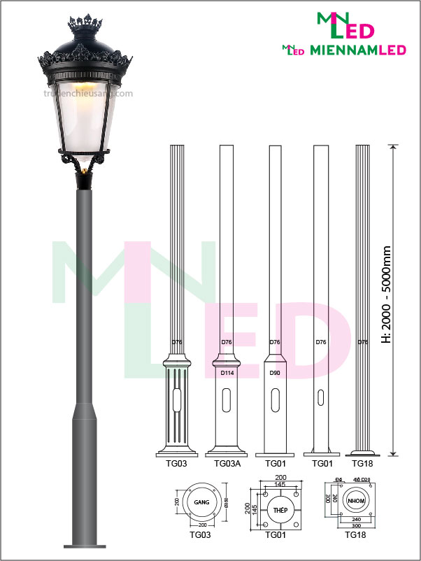 - Vật liệu để chế tạo đế Trụ đèn led là nhôm hoặc gang, thép mạ kẽm, hàn gia công, thân đèn được làm từ gang đúc, nhôm định hình, thép ống.