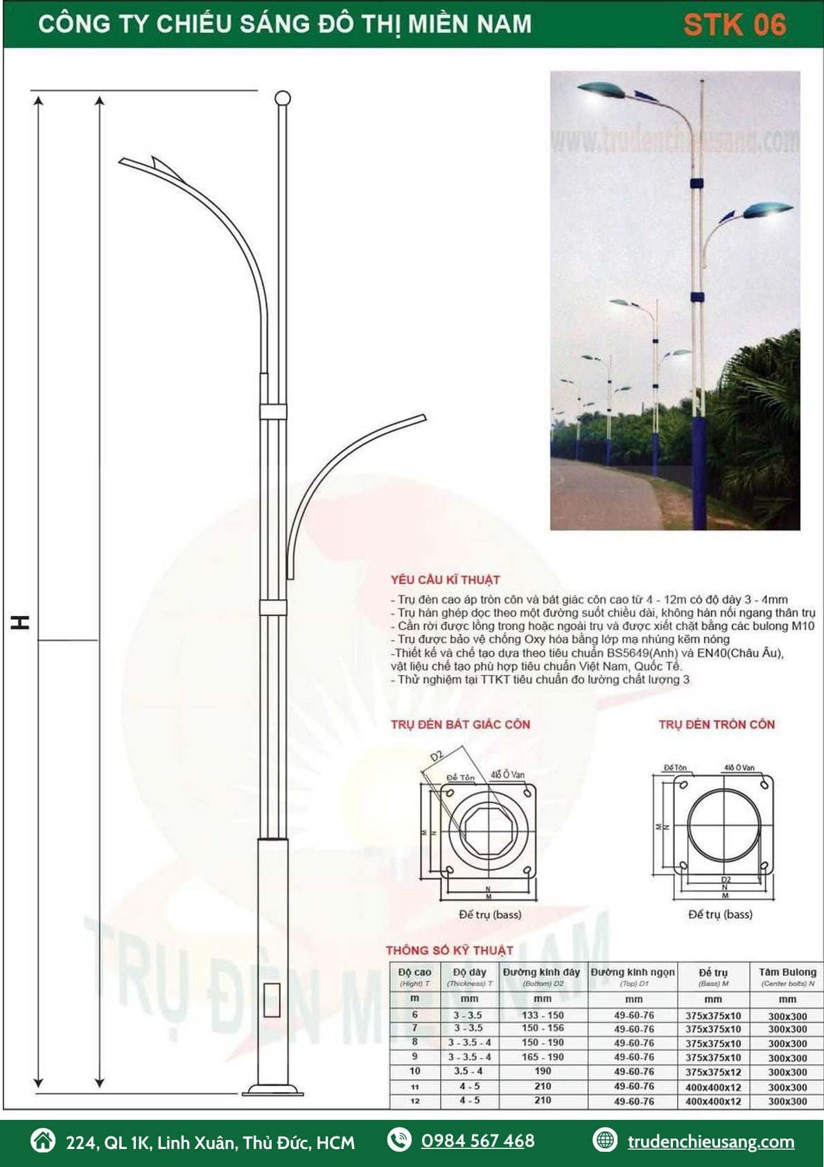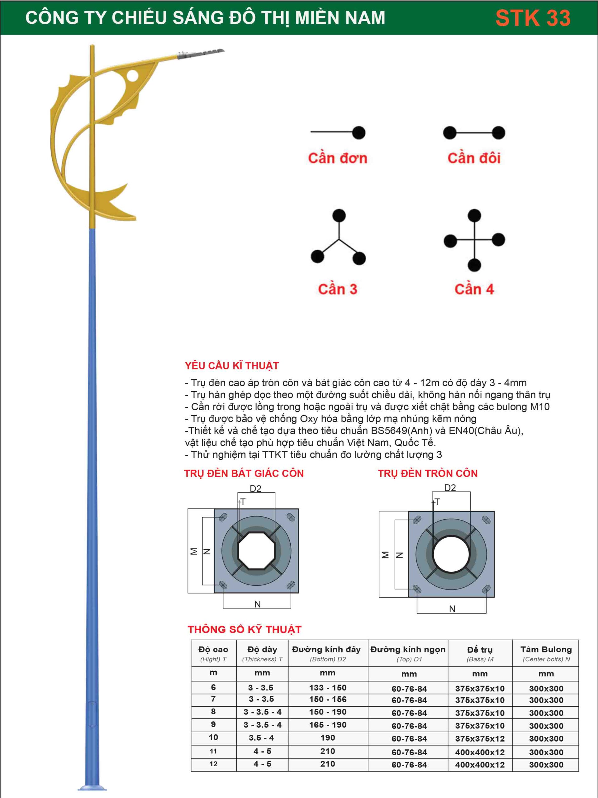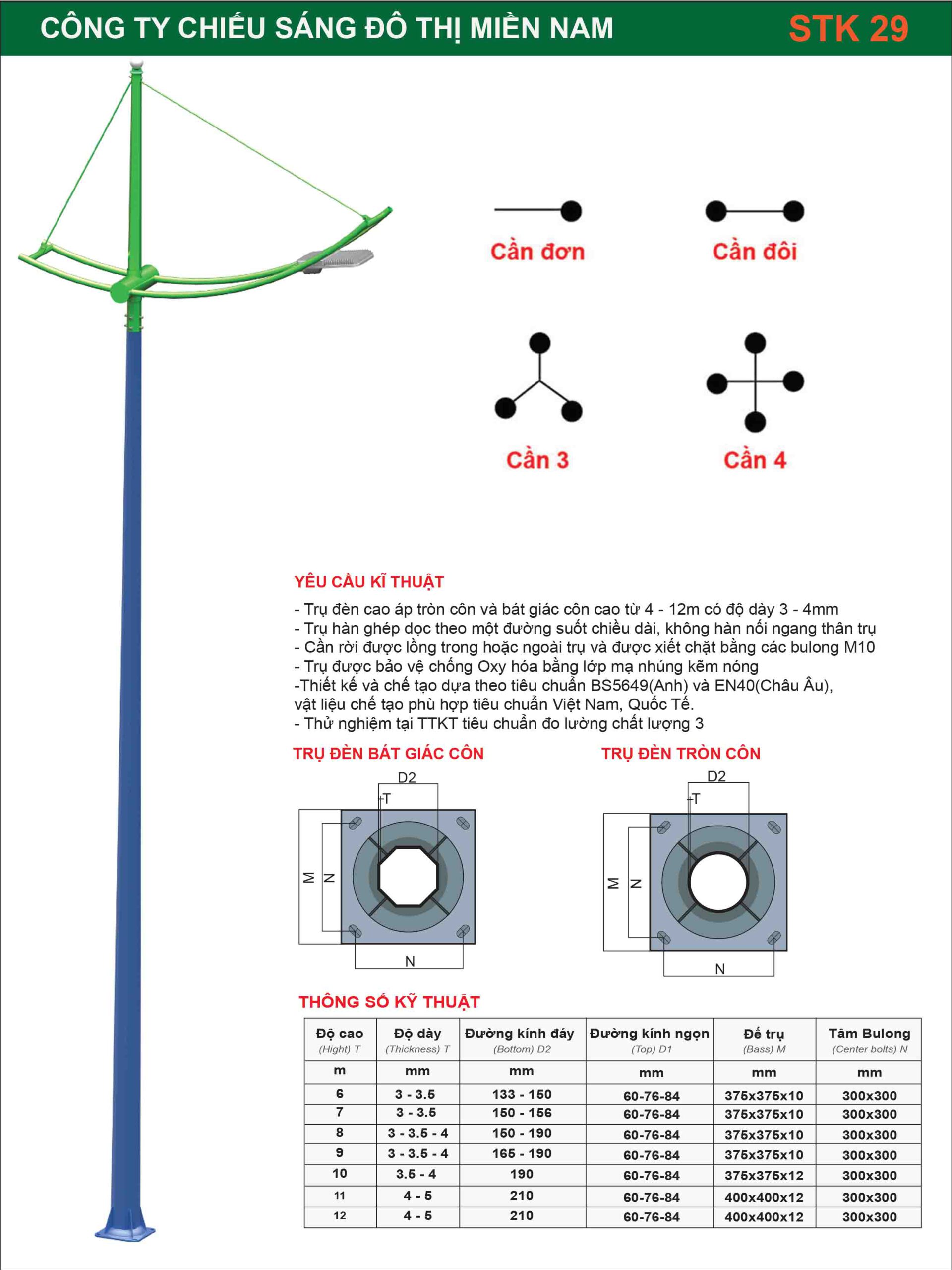 – Trụ đèn Cao áp cao 12m, dày 4mm, D60/191mm. Đế 375x375x12mm