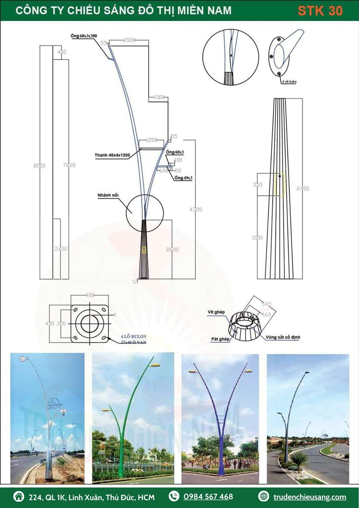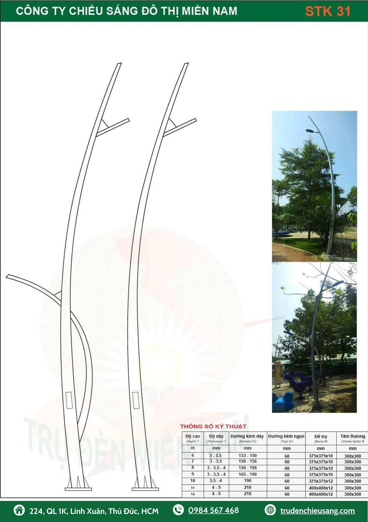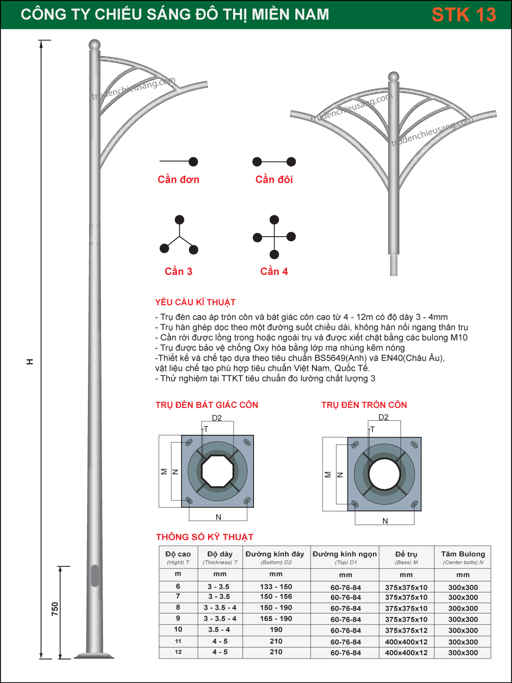– Trụ đèn Cao áp cao 12m, dày 4mm, D60/191mm. Đế 375x375x12mm
