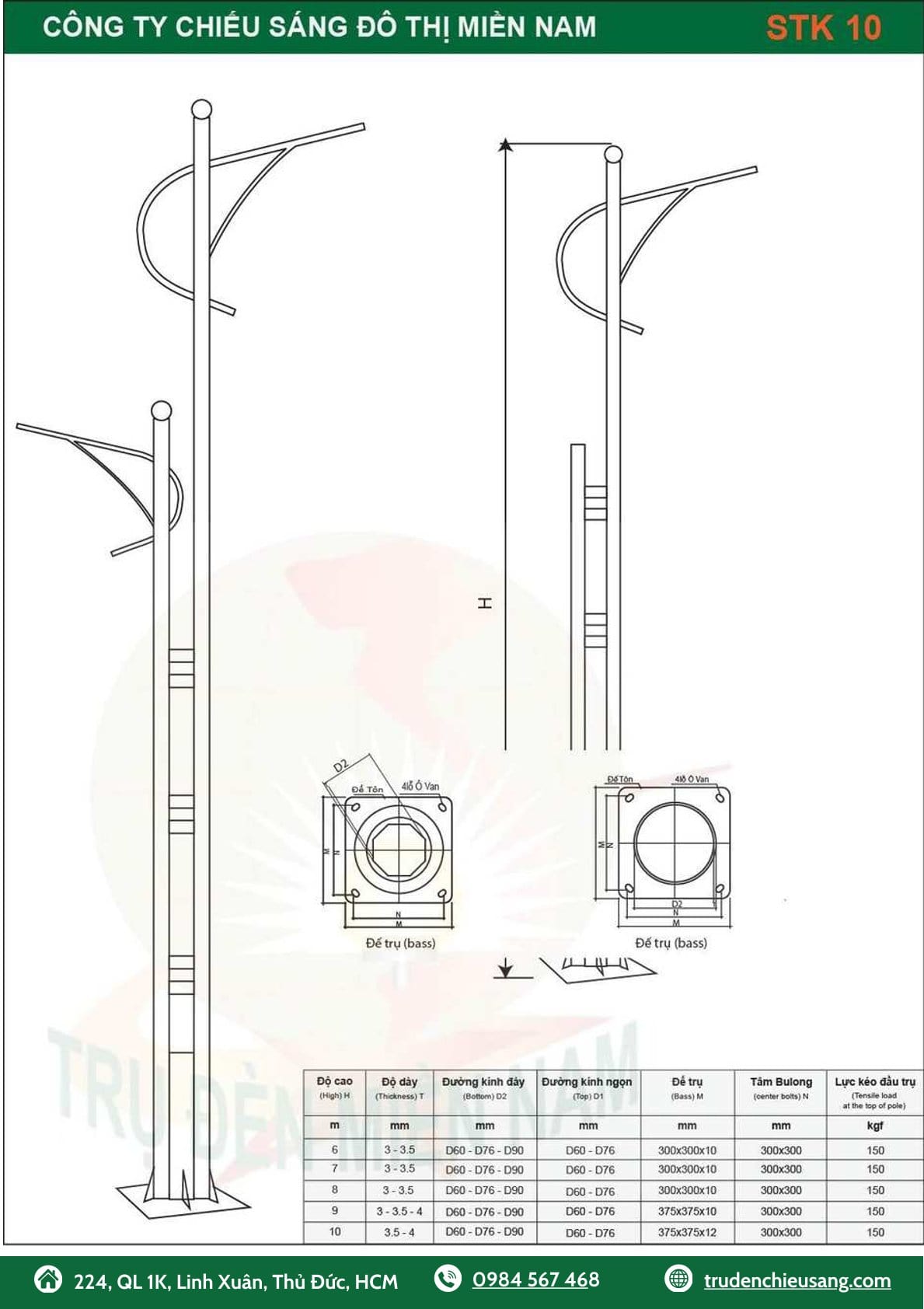 – Trụ đèn chiếu sáng Cao áp cao 10m, dày 3mm, D60/191mm. Đế 375x375x12mm