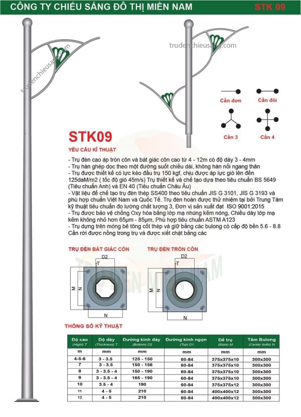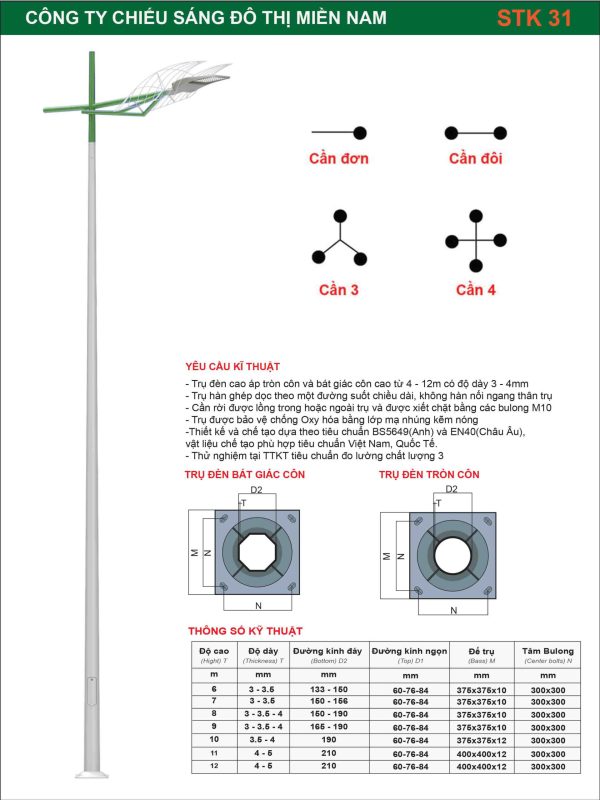 - Trụ đèn cao áp: đa dạng về mẫu mã, chất liệu (thép, nhôm, bê tông, composite) và chiều cao, đáp ứng mọi nhu cầu chiếu sáng.