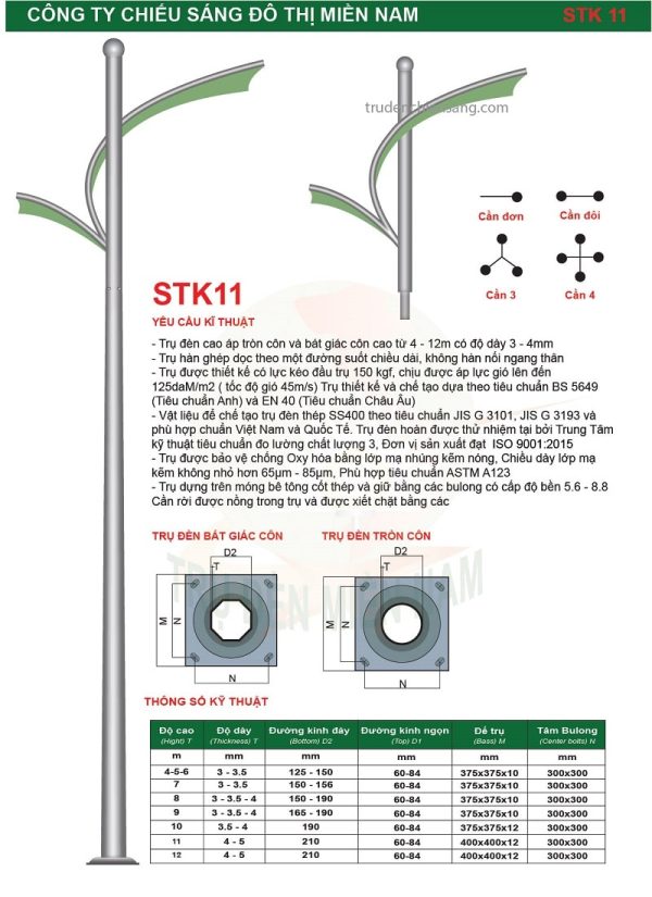 – Trụ đèn đường Cao áp cao 11m, dày 4mm, D60/191mm. Đế 375x375x12mm.